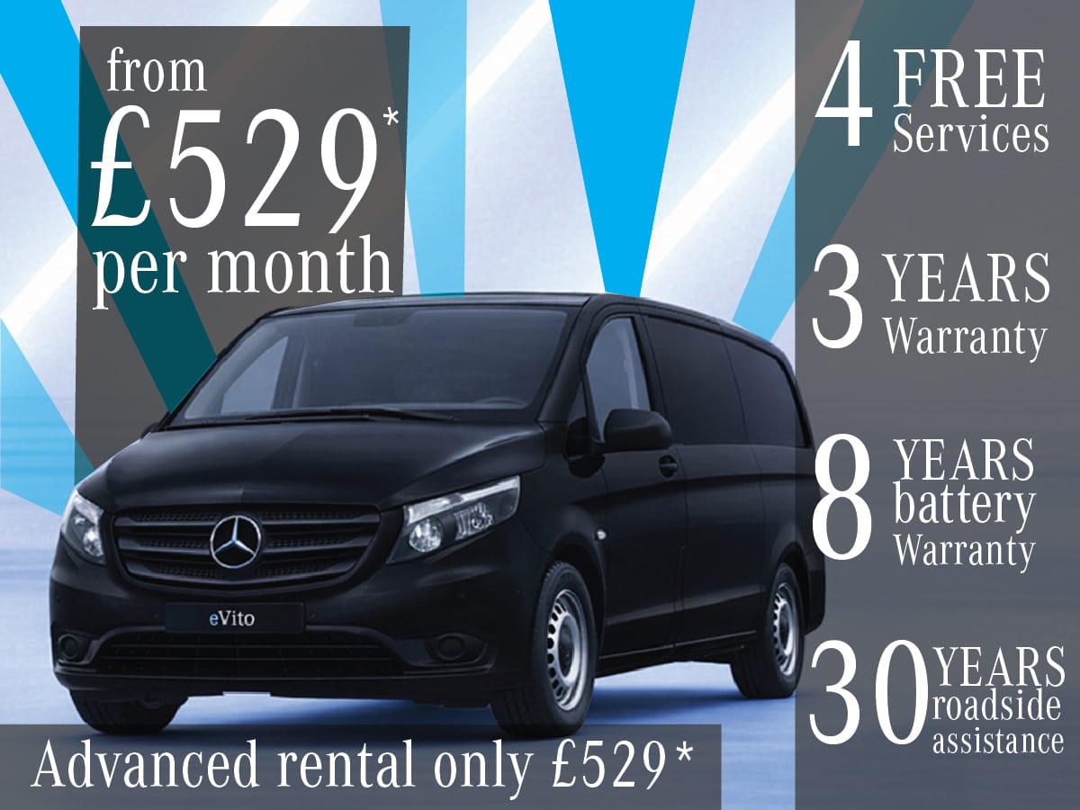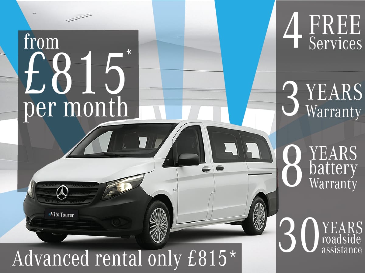 The eVito Tourer is now available from £815* + VAT per month with an advanced rental of just £815+VAT on an Operating Lease agreement.